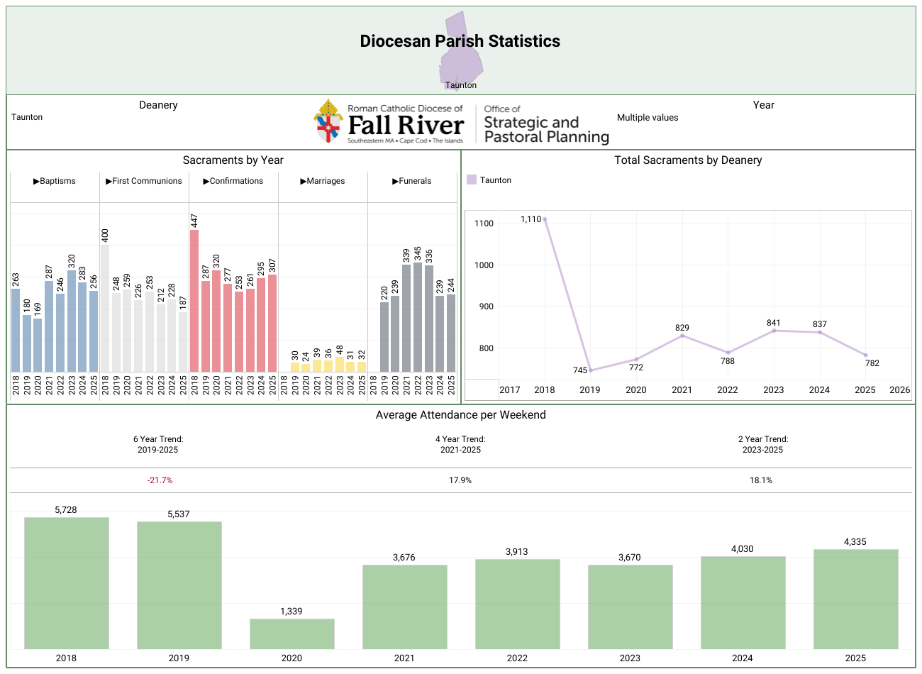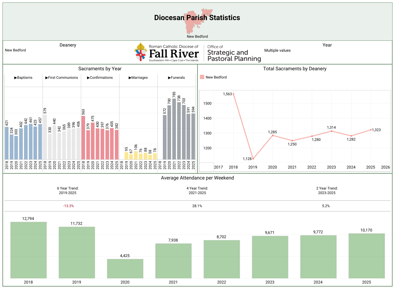Here are both the combined data of the entire diocese and a breakdown by the five deaneries.